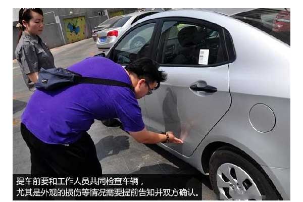 四、签合同的最后一项内容是填写验车单,这是双方共同认定车况的过程。此过程涉及到还车时的再认定,因此一定要认真对待。首先要从外观上对车辆进行检查,例如车体有无划痕,车灯是否完整,车锁是否正常等。然后打开车盖,查看冷冻液、机油、电瓶的状况,均无异常后,即可进入驾驶室内, 检查油表、刹车、空调的运行状况,并进行试驾,判断车辆的基本状况。对于一些车型的特殊功能及用法,应向租赁公司咨询清楚,如富康车的儿童锁功能等,以利更加方便的使用。