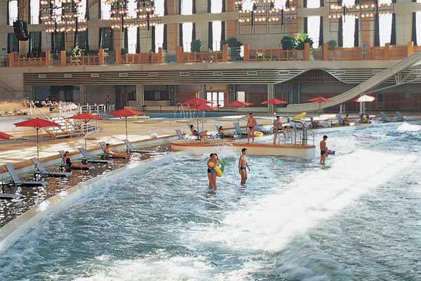 其中拥有1200平米淋浴、桑拿空间,2000平米温泉洗浴空间,10000余平米的水主题娱乐空间;配套保健、娱乐系统有滑冰场、乒乓球厅、台球厅、大型酒吧、茶馆、KTV歌厅、按摩厅、休闲厅、VIP包房等等,以及完善的餐饮服务系统。晚上,集冰、水、火、“美人鱼”、歌舞技巧与水幕电影、声光奇观的大型演出,可同时容纳2000余人观赏。