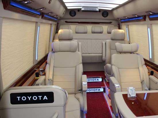 首先从丰田考斯特的车身外形上来说,为满足高端客户针对公务、商务活动以及办公需求而专门设定。首先我们看到的是车身端庄典雅的米黄金色,金属漆的设置,没有纯金色的刺眼,在端庄之中不失柔和之感。镀铬防蹭之上平行增加彩色腰线,色彩的搭配尽显贵族风范。在车轮处增加装饰轮罩,既能保护车轮确保行驶安全又可以增加车的美观,更显高贵之态。在车头的改装设计上,色调不再单一,镀铬前格栅再加上醒目的镀金丰田标志,更体现出车头设置的精细美观。大灯以及雾灯均才有镀铬技术,增加车身的美观