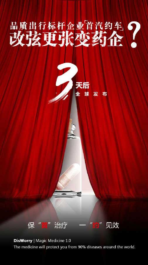 在偌大的画面上,红幕布之后只露出了模糊的一角。经过无数网友查验,证明了露出的瓶子就是我们常见的药瓶,官方的文案上也提到了“改弦更张变药企”,这让之前还是“福尔摩斯”的网友们都彻底懵了,难道首汽约车真的要变身药企,开始卖药?这中间的跨度未免也太大了一点。