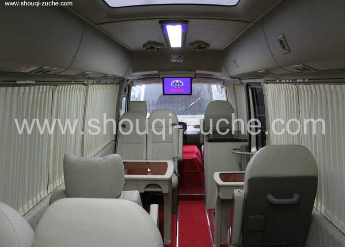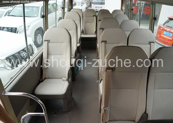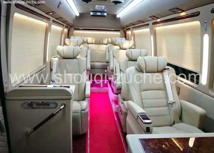 柯斯达原型车里面有20至23个座位,坐在里面相当拥挤,腿都会顶到前面座椅。我们这款柯斯达采用10座设计,空间上面绝对是奢侈的,椅子还可以旋转。