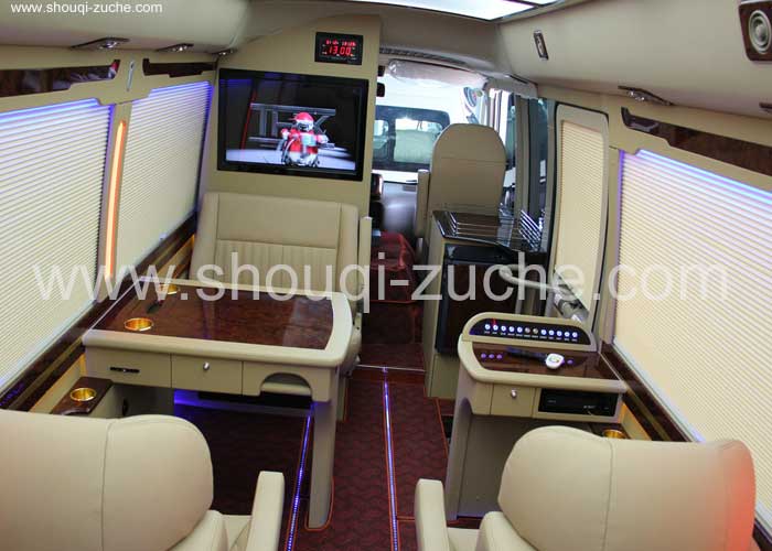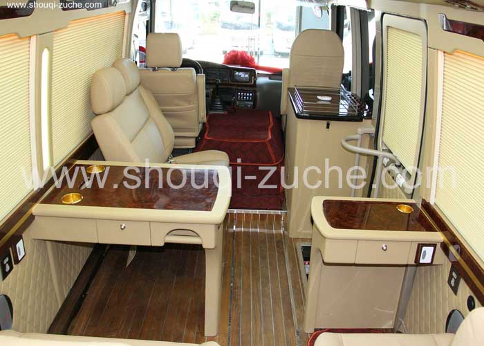 车后方有飞利浦空气进化器,地板采用的是全进口游艇级别柚木,并且镶嵌铜条,防潮防腐。车内大量使用桃木装饰,奢华尊贵。前面还有个40L的冰箱,可以放些饮料和水果等。冰箱上方是虎牌的烧水壶,平时可以喝喝茶,咖啡,并且有个液晶电视机,一边看看球赛,新闻,一边和三五好友喝喝茶。