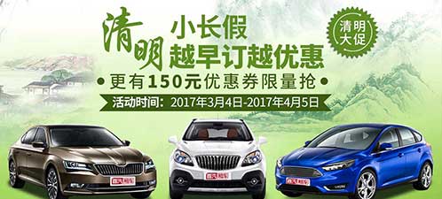 首汽租车在2017年3月4日-2017年4月5日期间推出150元优惠券限量抢和清明指定车型双重优惠活动。只要用户租用清明节指定车型,就能获得“租满3天租金立减50元和租满4天立减100元”的费用减免。限定车型为MGGS、标致3008、标致2008、大众斯柯达野帝、大众斯柯达速派、标致508等六款车型,涵盖SUV、微轿、中级轿车等三个品类,车型租价实惠,加上清明指定车型优惠,单天租金可省15-20元,让租车出行更具有性价比。