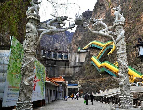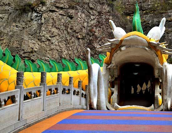 龙庆峡景区有个标志性的“龙”,这个人造龙很有特点:龙体顺山势修建逐渐升高,龙头在山脚下张开大嘴。不用说这一定是个上山的通道呗。