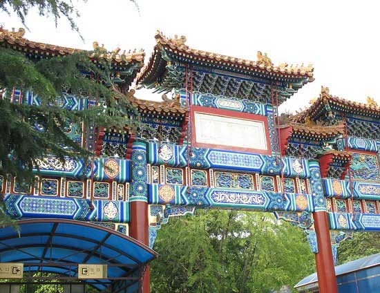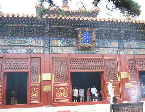 往北,有八角碑亭,内有乾隆御制碑文,陈述雍和宫宫改庙的历史渊源,以汉、藏、满、蒙四种文字书写,分刻于左右碑。 雍和宫建筑群的形成,在清代的历史上,前后跨越康熙、雍正、乾隆三朝,经历王府、行宫、庙宇三个时期。门票:25元,学生证半价,购买门票后还会赠送一张介绍雍和宫的小光盘。公交路线:乘坐地铁2号线、5号线在雍和宫站下C出口往南100米,乘坐116路、117路公交车请在雍和宫站下车。在雍和宫附近就有很多小吃店,金鼎轩、狗不理包子、