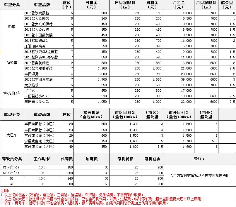 北京租车价格表价格特别说明: