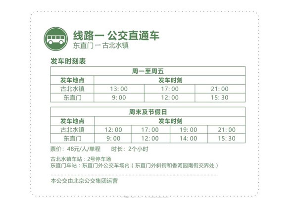 另外,东直门至古北水镇直通车从明天(4月1日)起,也会进行班次及发车时间的调整,请小伙伴们仔细阅读下方信息。