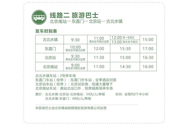 认为从北京南站、北京站换乘地铁至东直门乘坐直通车太麻烦?没关系,为满足广大游客出行需求,北京精诚假期国际旅游有限公司自明日(4月1日)起开展古北水镇欢乐行活动。开通北京南站至古北水镇的往返旅游巴士(途径北京站、东直门站)。游客到达古北水镇后,自行购买入园门票,景区内自由活动。
